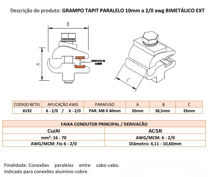 Conector Paralelo Bimetálico Tapit para fazer a conexão paralela entre cabos, para conexão de alumínio com cobre, com conexão por aperto.